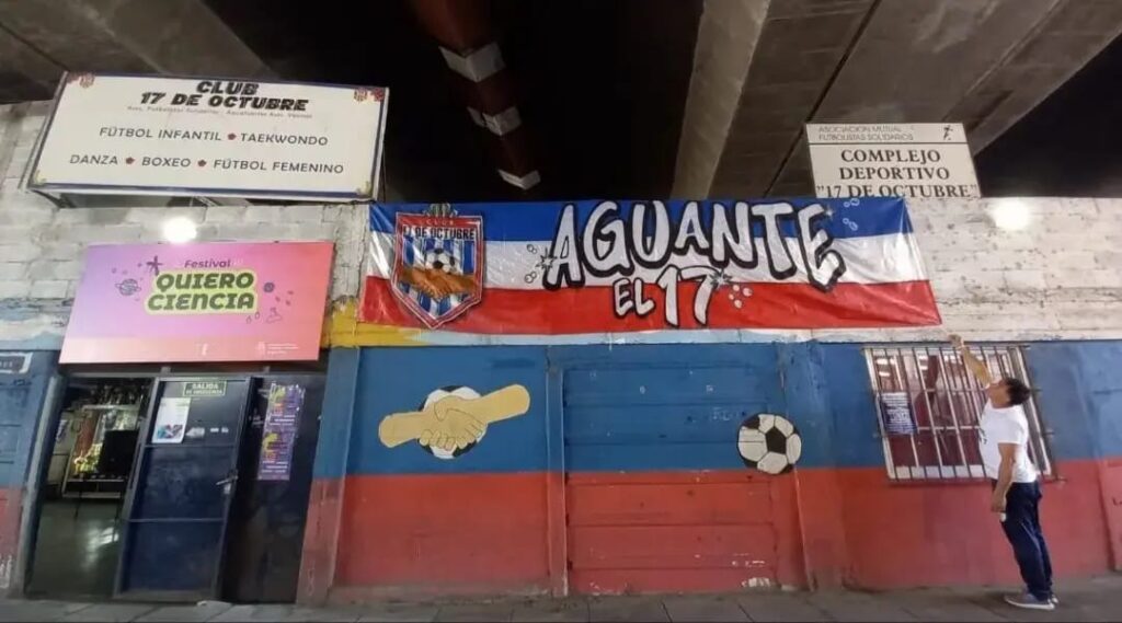 Los inspiradores que lograron su puesta en marcha, es decir sus genuinos fundadores, fueron los hermanos Leonardo y Mariano Militello y Francisco de Isla, los dos primeros pertenecientes a la Asociación Aguafuertes y el tercero a cargo de la tesorería de la Mutual de Futbolistas Solidarios que había abandonado Sanfilippo. Si bien el Club 17 de octubre se inició formalmente en diciembre de 2012, fecha en que la Legislatura porteña le asignó la concesión del Predio junto al Flores Sur, desde mucho tiempo antes sus promotores venían trabajando en el vecindario a través de la Asociación Aguafuertes. Esta entidad viene funcionando desde marzo de 20002 en Primera Junta 2533, y allí continúa abordando distintas temáticas: apoyo a la escolaridad de niños y adolescentes, salud mental, prevención de las adicciones y talleres de formación artística y de formación y orientación laboral. Muchas de ellas ahora encontraron cabida en la sede de Club 17 de octubre.